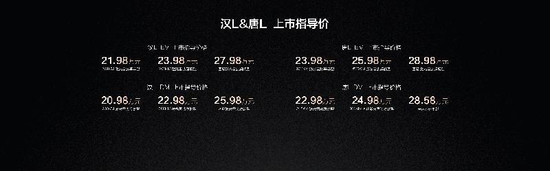 【小熊在線】比亞迪劃時代旗艦漢L唐L已正式上市,推出漢L EV、漢L DM、唐L EV、唐L DM四大車系,并分別推出6大配置版本,售價為20.98萬~28.98萬元,強力沖擊中高端市場。