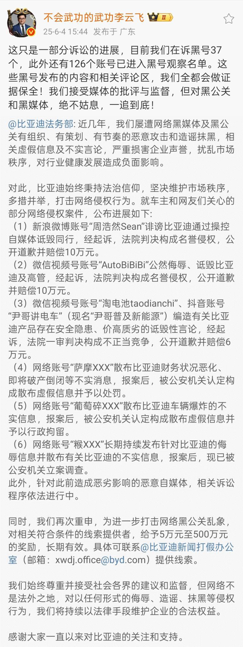 【小熊在線】今日,比亞迪法務(wù)部發(fā)文公布近期多起維權(quán)成果,網(wǎng)絡(luò)賬號“周浩然Sean”因誹謗比亞迪操控自媒體詆毀同行,經(jīng)法院判決構(gòu)成名譽(yù)侵權(quán),須公開道歉并賠償10萬元;“AutoBiBiBi”因公然侮辱、詆毀比亞迪及高管,經(jīng)法院判決構(gòu)成名譽(yù)侵權(quán),同樣須公開道歉并賠償10萬元。“淘電池taodianchi”、“尹哥講電車(現(xiàn)名“尹哥普及新能源”)”編造有關(guān)比亞迪產(chǎn)品安全隱患、價(jià)高質(zhì)劣等詆毀性言論,被法院一審認(rèn)定構(gòu)成不正當(dāng)競爭,除公開道歉外,還須賠償6萬元。此外,“薩摩XXX”“葡萄碎XXX” 因散布比亞迪財(cái)務(wù)狀況惡化、車輛爆炸等不實(shí)消息,被公安機(jī)關(guān)認(rèn)定構(gòu)成散布虛假信息并予以處罰;“糇XXX”長期持續(xù)發(fā)布侮辱信息與不實(shí)內(nèi)容,目前已被公安機(jī)關(guān)立案調(diào)查。隨即,比亞迪集團(tuán)品牌及公關(guān)處總經(jīng)理李云飛轉(zhuǎn)發(fā)比亞迪法務(wù)發(fā)文,并表示:“這只是一部分訴訟的進(jìn)展,目前我們在訴黑號37個,此外還有126個賬號已進(jìn)入黑號觀察名單。這些黑號發(fā)布的內(nèi)容和相關(guān)評論區(qū),我們?nèi)紩鲎C據(jù)保全!我們接受媒體的批評與監(jiān)督,但對黑公關(guān)和黑媒體,絕不姑息,一追到底!”