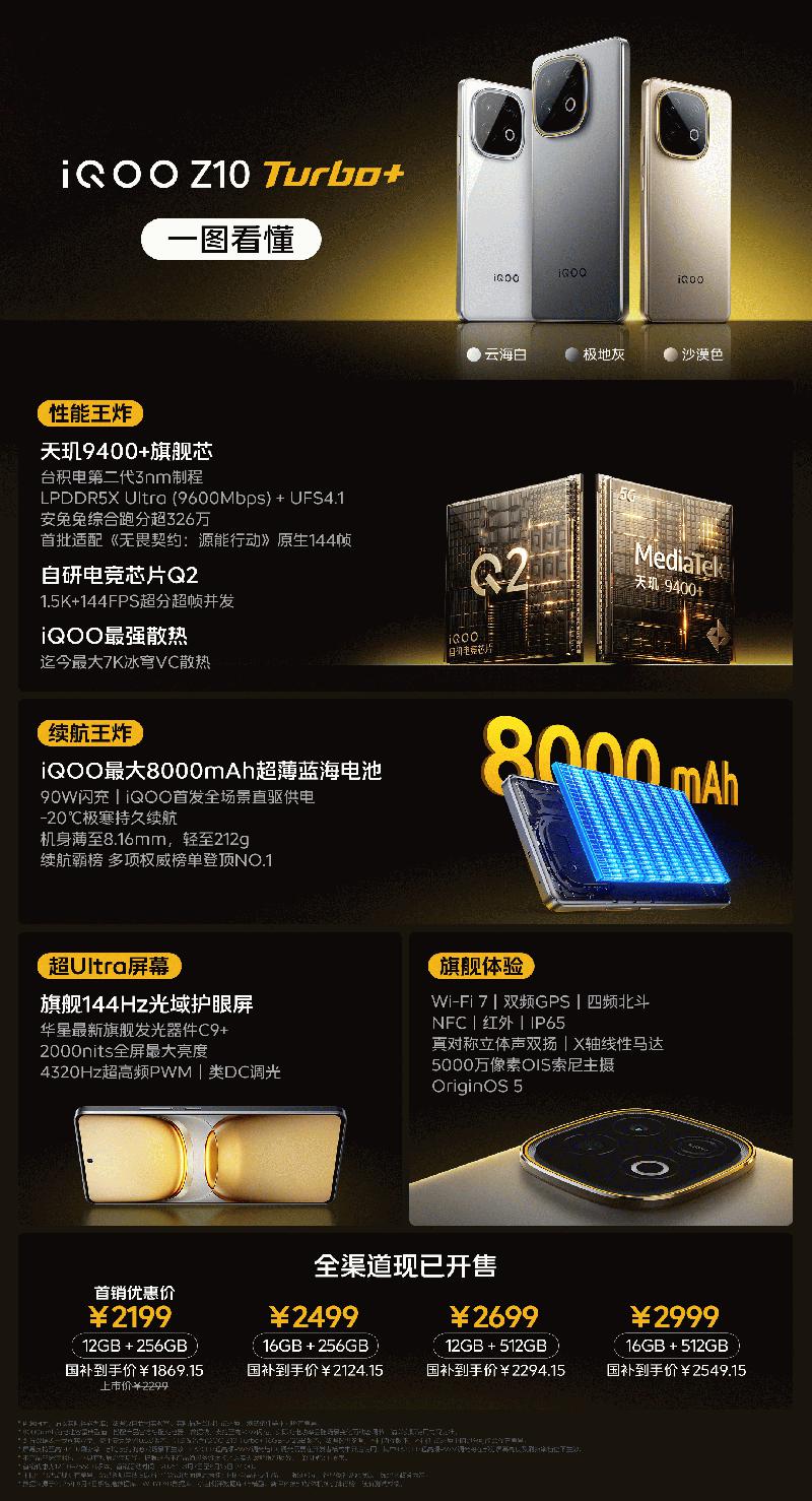 “性能續航雙王炸”iQOO Z10 Turbo+ 以 8000mAh 超薄藍海電池和天璣 9400+旗艦平臺鑄就行業唯一的超大電池旗艦性能機,并具備旗艦屏幕和旗艦體驗,擁有“極地灰”、“沙漠色”和“云海白”三種配色可選,提供 12GB+256GB(2299 元,首銷優惠價 2199 元)、12GB+512GB(2499 元)、16GB+256GB(2699 元) 和 16GB+512GB(2999 元)多版本可選,國補到手價 1869.15 元起!享 6 期免息,首銷購機享價值 365 元服務全家桶!學生購機額外專享 358 元權益禮包!