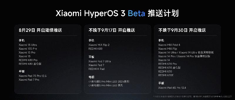 小米澎湃OS 3將于2025年8月29日為首批Beta機型開啟陸續推送,覆蓋Xiaomi 15系列、Xiaomi Pad 7S Pro 12.5、Xiaomi Pad 7 Pro、REDMI K80 Pro、REDMI K80 至尊版,并將陸續為更多機型開啟推送。如需了解支持機型及具體計劃,請持續關注小米官網及小米社區公告。