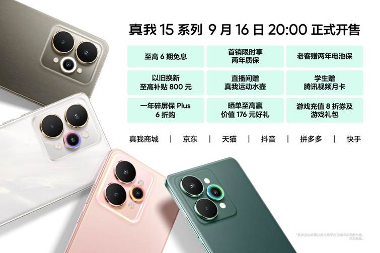 價格與發售政策上,真我15系列延續高性價比路線:真我15T首銷價1199元起(8GB+128GB),真我15首銷價1699元起(8GB+256GB),真我15 Pro首銷價1999元起(12GB+256GB)。9月16日20:00正式開售后,首銷用戶可享購機立減200元、贈1年延長保、至高6期免息、以舊換新至高800元補貼等多重福利,學生群體還可額外獲贈騰訊視頻月卡與游戲禮包。