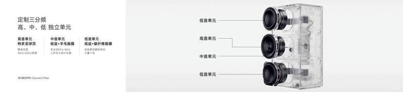Xiaomi Sound 2 Max 搭載了 4 枚深度定制的主動(dòng)聲學(xué)單元,分別負(fù)責(zé)低音、中音和高音的聲音表達(dá)。其中,中音單元和高音單元采用了同軸設(shè)計(jì),提高了聲源的一致性。相比非同軸單元,同軸共點(diǎn)單元能夠?qū)⒙曇敉扑偷礁蠼嵌群头秶煌?tīng)音位的聲學(xué)一致性更強(qiáng),從而帶來(lái)更強(qiáng)的指向性。Xiaomi Sound 2 Max 將經(jīng)典的MTM(Midwoofer-Tweet-Midwoofer)與中高音同軸單元像結(jié)合,利用 2 個(gè)低音單元和 1 個(gè)中高音同軸單元,組成了三分頻聲學(xué)系統(tǒng)。雙低音單元讓低頻的量感更加充足,下潛更深;中高音同軸單元,讓中頻人聲的細(xì)節(jié)更突出,同時(shí)高頻的延伸性也更好,動(dòng)態(tài)范圍大,分離度更高。為了兼顧監(jiān)聽(tīng)返聽(tīng)和日常音樂(lè)鑒賞,Xiaomi Sound 2 Max 內(nèi)置了小米專(zhuān)業(yè)監(jiān)聽(tīng)和小米夜鶯調(diào)音兩大模式。在監(jiān)聽(tīng)模式下,Xiaomi Sound 2 Max 擁有極為平直的頻率響應(yīng):50Hz-21kHz(±2.5dB),可供專(zhuān)業(yè)級(jí)用戶(hù)在錄音棚、音樂(lè)工作室等場(chǎng)景下進(jìn)行混音制作、音頻檢查等工作。