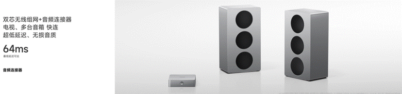 為了給用戶(hù)創(chuàng)造更加沉浸的聽(tīng)覺(jué)感受,小米還同步推出了 Xiaomi Sound 無(wú)線(xiàn)音頻連接器,采用專(zhuān)業(yè)的獨(dú)立組網(wǎng)芯片,搭載小米私有無(wú)線(xiàn)音頻傳輸協(xié)議,帶來(lái)媲美有線(xiàn)的穩(wěn)定連接性能,避免了線(xiàn)材部署的麻煩。Xiaomi Sound 無(wú)線(xiàn)音頻連接器可通過(guò) HDMI 或 S/PDIF 接口的線(xiàn)材(HDMI 線(xiàn)材需支持 HDMI ARC 或 HDMI eARC)連接電腦、電視、投影儀等播放設(shè)備,在小米音箱APP上快速完成設(shè)備配網(wǎng)并將兩臺(tái) Xiaomi Sound 2 Max 組成 2.0 立體聲,或?qū)⑺呐_(tái) Xiaomi Sound 2 Max 組合成 4.0 環(huán)繞聲。Xiaomi Sound 無(wú)線(xiàn)音頻連接器支持多臺(tái)音箱組合下的 CD 級(jí)無(wú)損音頻傳輸,同時(shí)能提供全鏈路超低時(shí)延,經(jīng)實(shí)測(cè)默認(rèn)模式下,時(shí)延可穩(wěn)定在60ms級(jí)別。此外,Xiaomi Sound 無(wú)線(xiàn)音頻連接器還能將常規(guī)的 2.0 立體聲自動(dòng)轉(zhuǎn)換為 4.0 環(huán)繞聲,并能適配市面上主流的電視品牌,讓用戶(hù)居家就能體驗(yàn)到影院級(jí)的沉浸聲場(chǎng)。