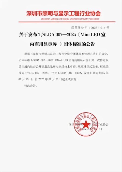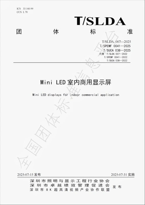 在全球新型顯示技術加速演進、市場規模持續擴大的背景下,Mini LED室內商用顯示領域迎來具有里程碑意義的重要時刻。2025年7月15日,由深圳市照明與顯示工程行業協會、深圳市卓越績效管理促進會、深圳市8K超高清視頻產業協作聯盟歸口的《Mini LED室內商用顯示屏》團體標準(T/SLDA 007-2025、T/SPEMF 0041-2025、T/SUCA 038-2025)正式發布,并于7月31日實施。