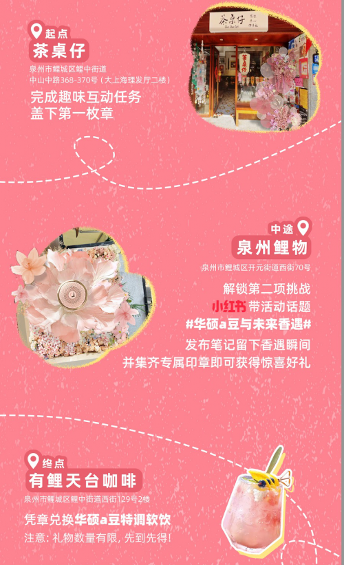 與此同時,華碩a豆還以“香”為線索,圍繞茶桌仔、泉州鯉物、有鯉天臺咖啡等三大泉州西街特色地標,開啟“豆叮的尋香之旅”集章打卡活動,完成指定任務即可解鎖限定好禮,在紅磚古厝和煙火交織的泉州街頭,邀你感受華碩a豆14 Air 香氛版的獨特魅力。